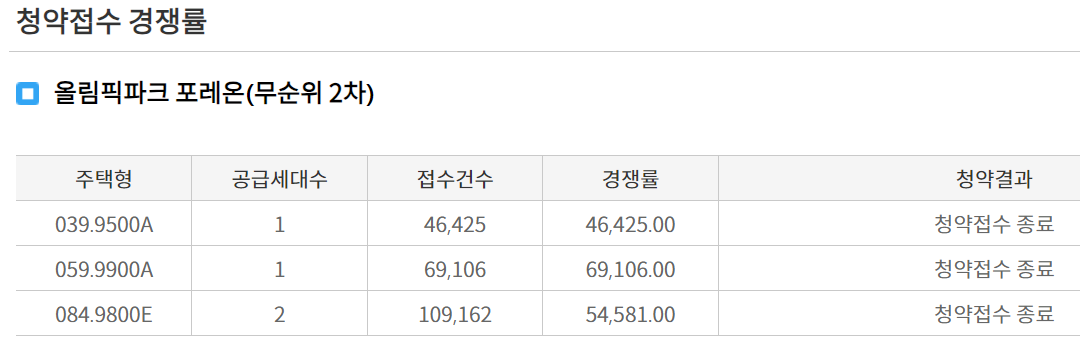 - 084.9800E형: 2세대 공급에 109,162건 접수 – 경쟁률 54,581:1